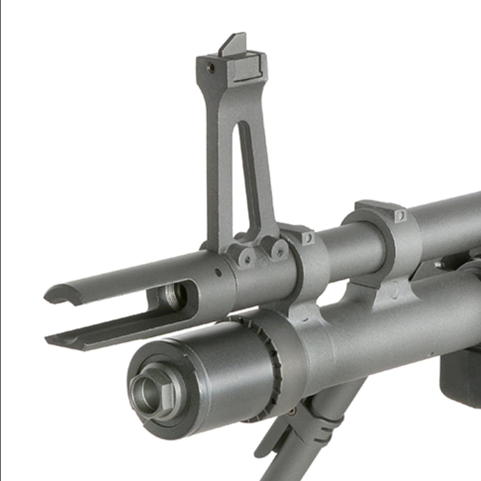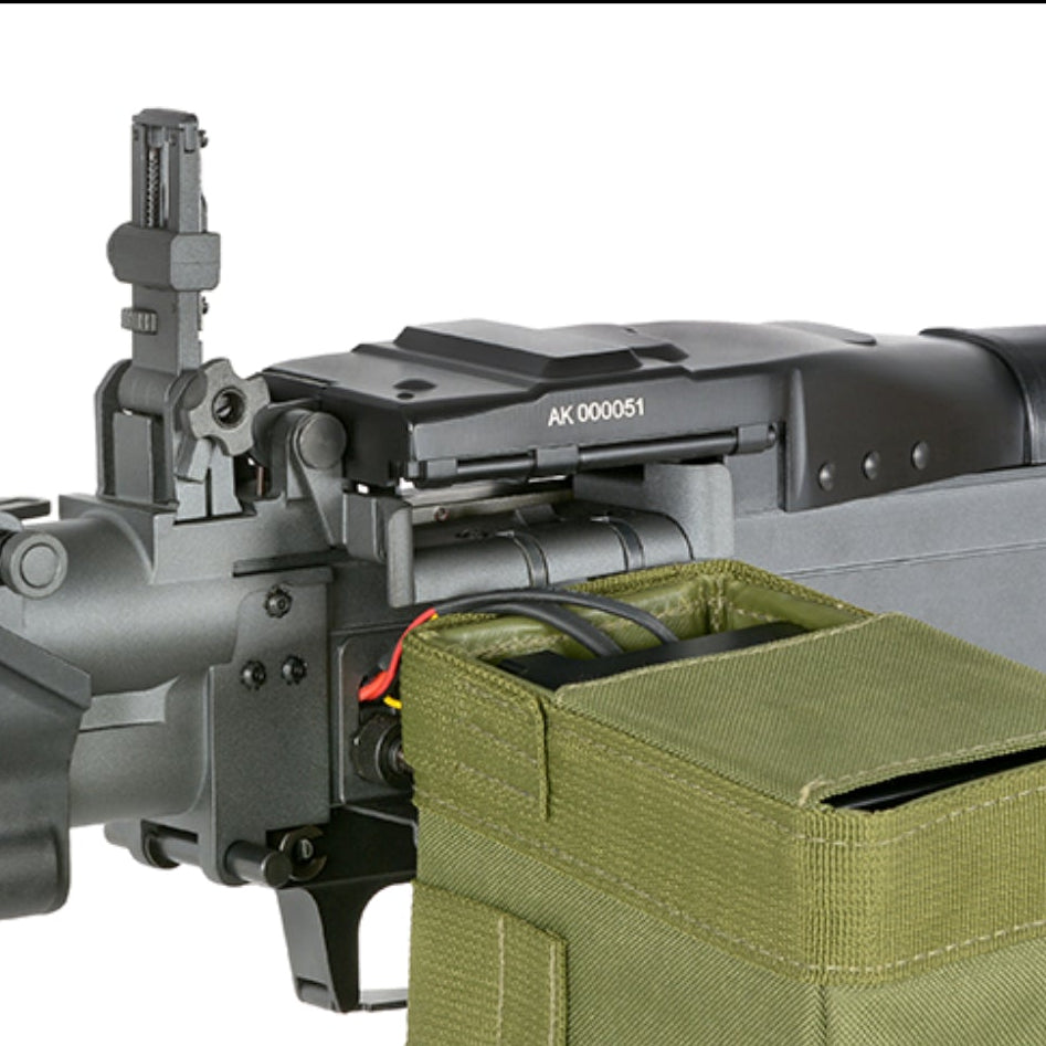 Außen ist das eine klassische LMG-Ansage: massiver Receiver, integriertes Bipod und ein elektrisches Box-Mag für konstante Versorgung im Spiel.