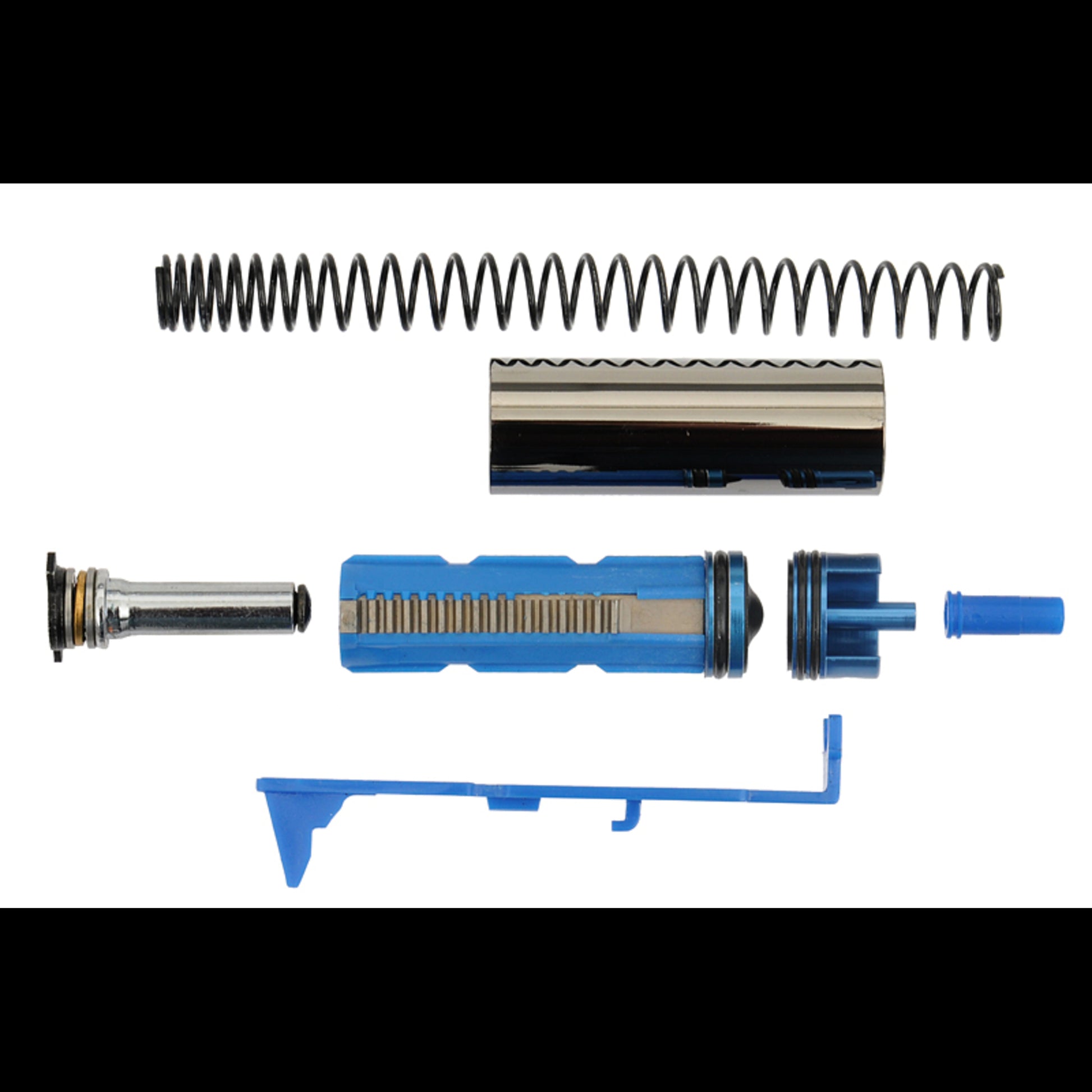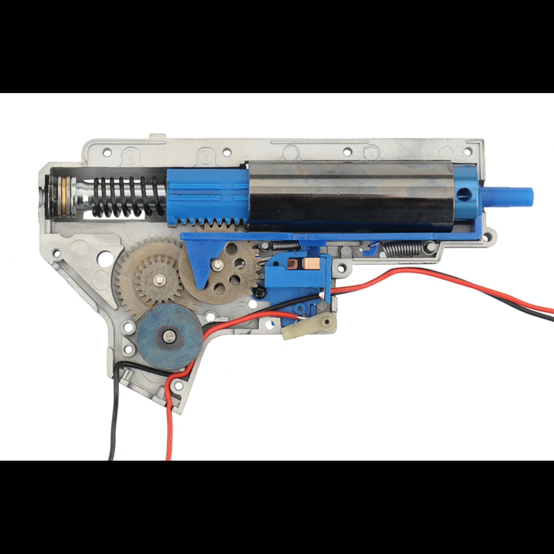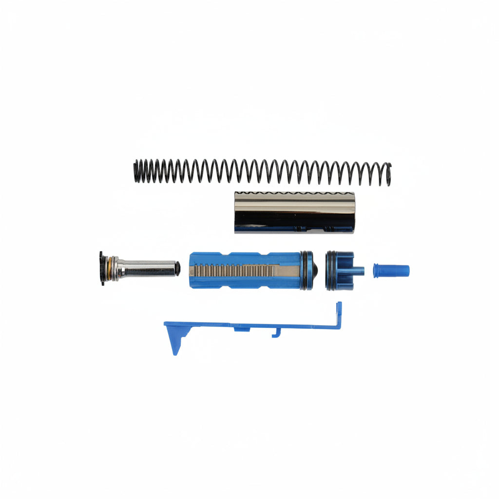 In der V2 Gearbox der Platinum-Serie steckt ein auf Haltbarkeit und zuverlässige Funktion ausgelegtes System. Die Zylindergruppe besteht aus Alu-Pistonhead, Alu-Zylinderhead und einem beschichteten Alu-Zylinder, dazu kommt ein Metall-Springguide für eine stabile Federführung. Der Piston ist als Stahlzahnpiston ausgeführt und auf Belastbarkeit im Antrieb ausgelegt. Nozzle und Tappet Plate sind als bewährte Polymerteile umgesetzt, wie sie in dieser Bauweise üblich sind.