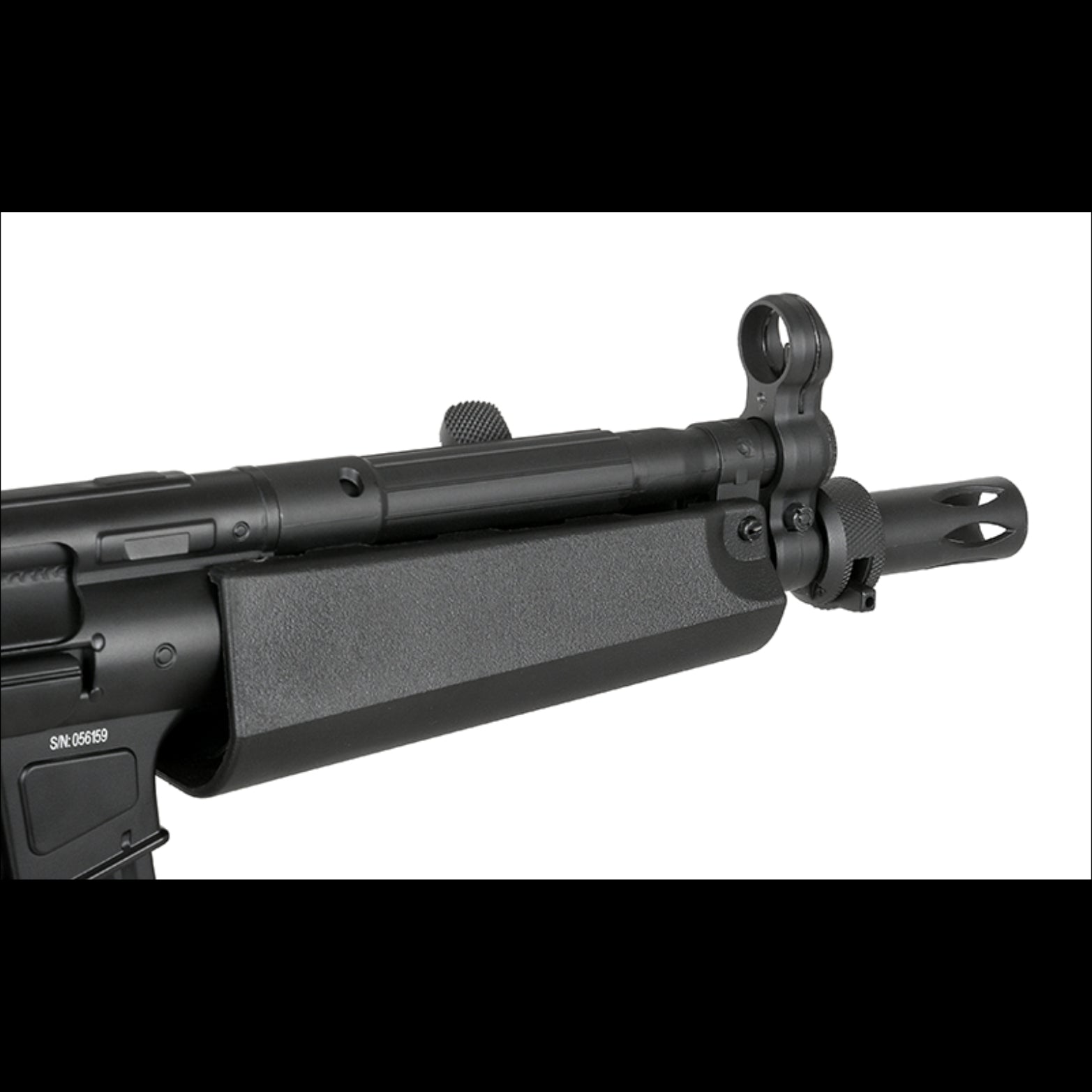 Der Akkuplatz sitzt im Handguard, Anschluss ist Mini-Tamiya. Empfehlung bleibt 7,4V, weil das mechanische System damit zuverlässig und schonend läuft. ⚠️ Von stärkeren Akkus raten wir ab, um unnötige Belastung und mögliche Schäden am Antrieb zu vermeiden.