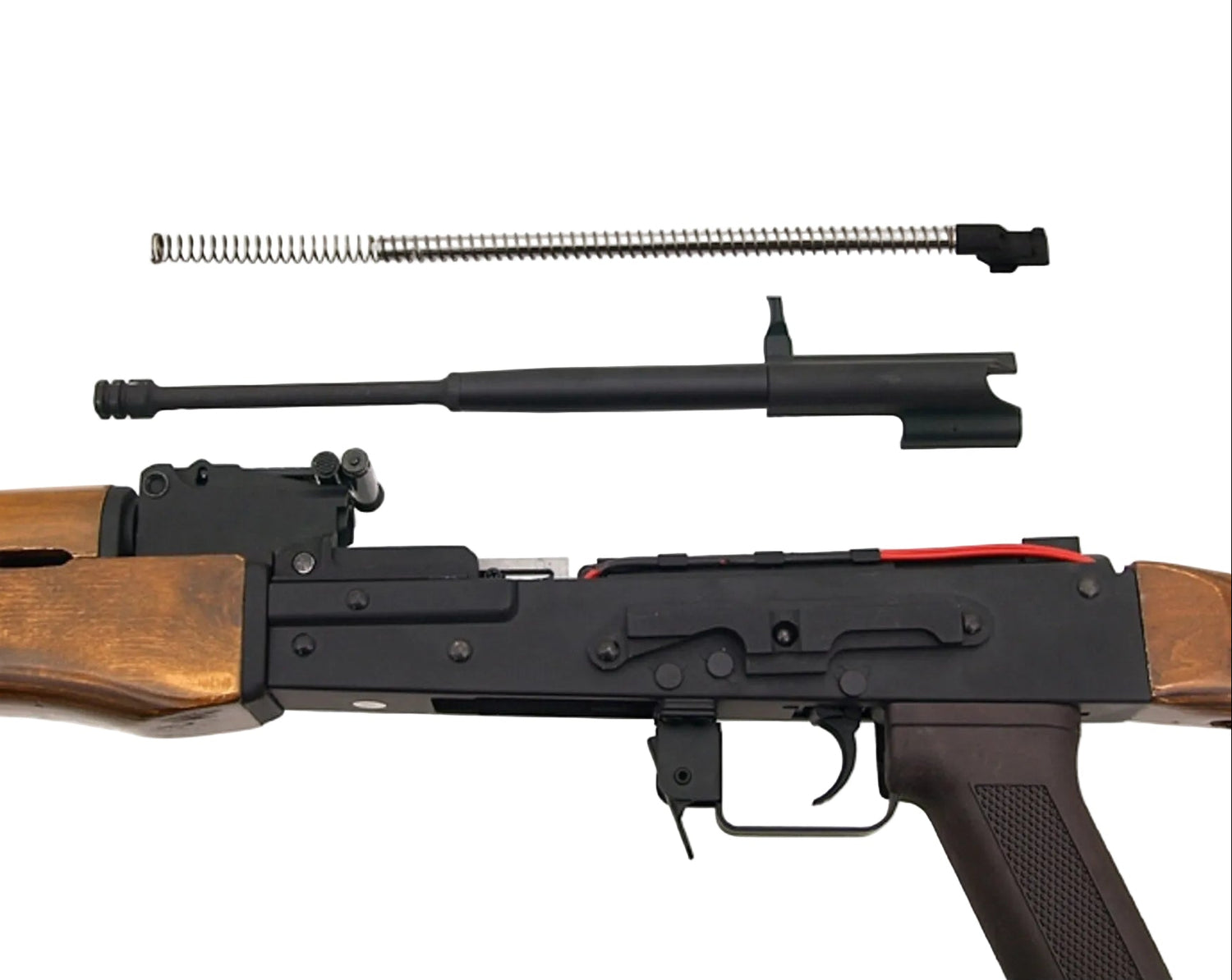 Die CM052 ist eine Vollmetall/Echtholz-RPK mit klarer AK-Anmutung und echten Bedienabläufen. Beim Fieldstrip kannst du AK-typisch das Top-Cover abnehmen, und beim Repetieren läuft der Mock-Bolt-Carrier voll mit, inklusive sattem Metallkontakt. Über den Ladehebel hältst du den Träger hinten und kommst damit direkt ans Hop-Up im Auswurffenster, genau wie man’s erwartet.