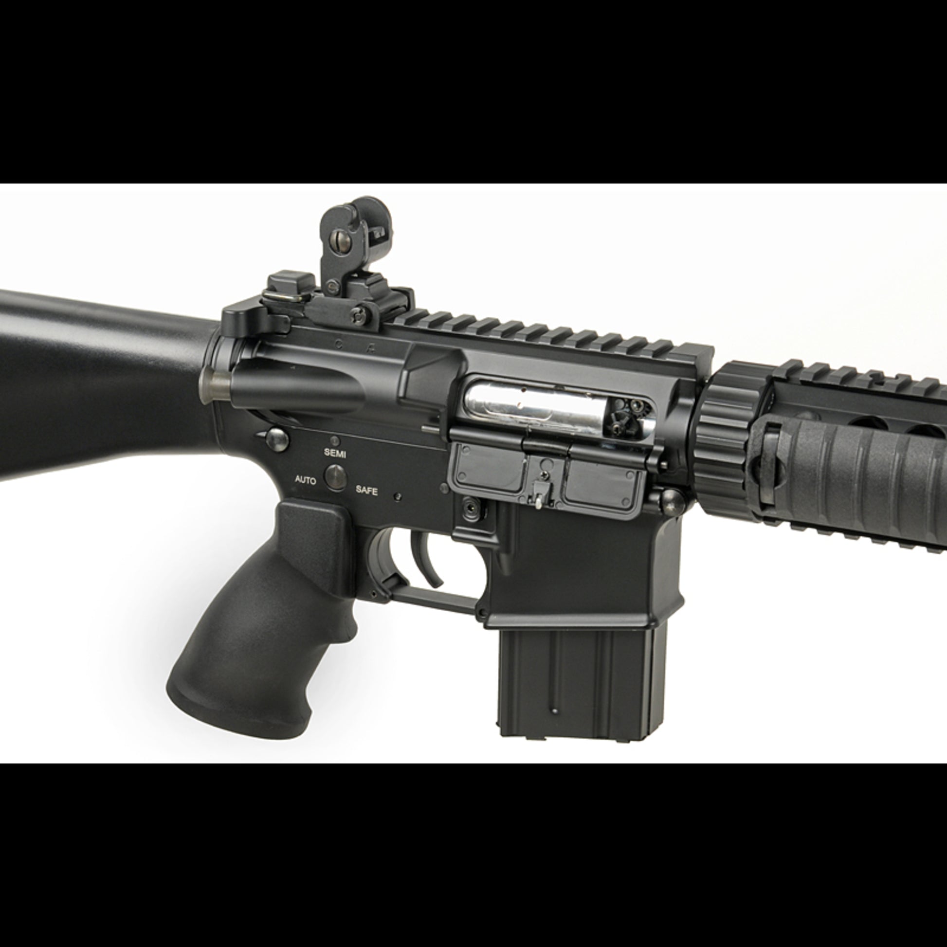 Der Aufbau ist klassisch SPR: Metall-Receiver, dazu ein Metall-Handguard mit oberer 20 mm Schiene für Optiken und Zubehör.