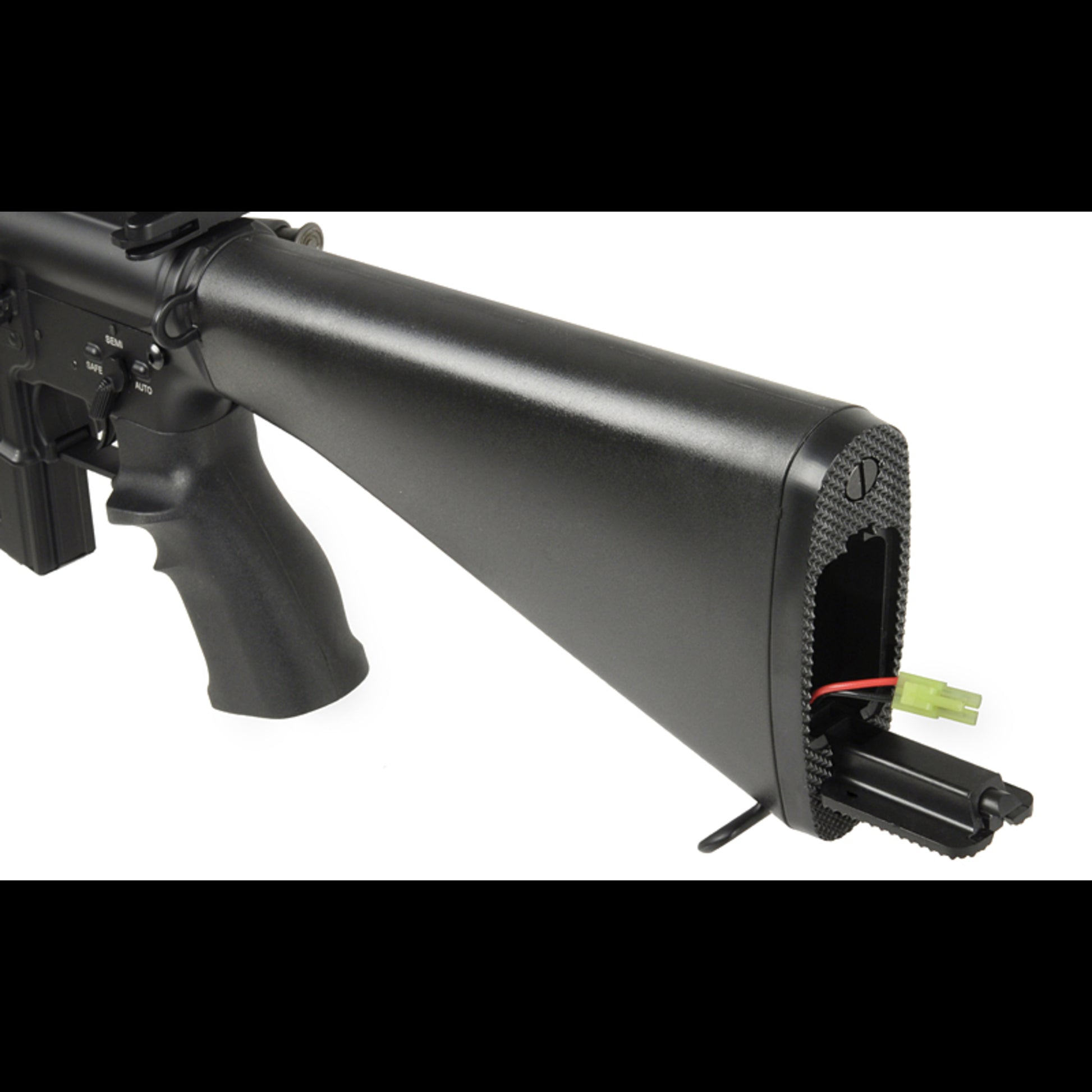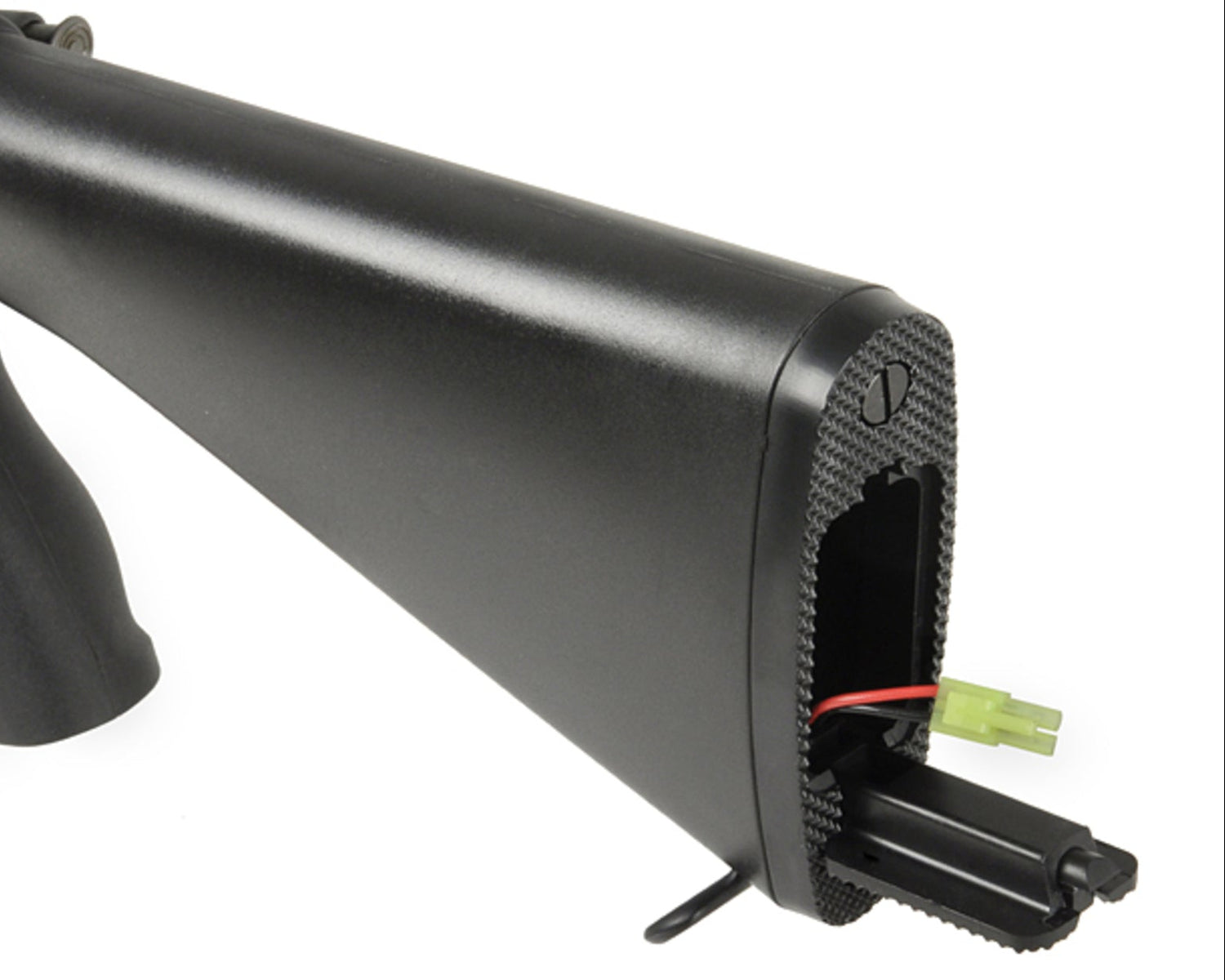 Der offene A2-Schaft bietet ungewöhnlich viel Raum für den Akku und macht das Setup deutlich entspannter. Empfohlen sind 7,4V LiPos mit Mini-Tamiya. Zusätzlich sorgt der A2-Schaft für eine stabile Schulterauflage und ein klassisches, ausbalanciertes Handling bei der Benutzung.