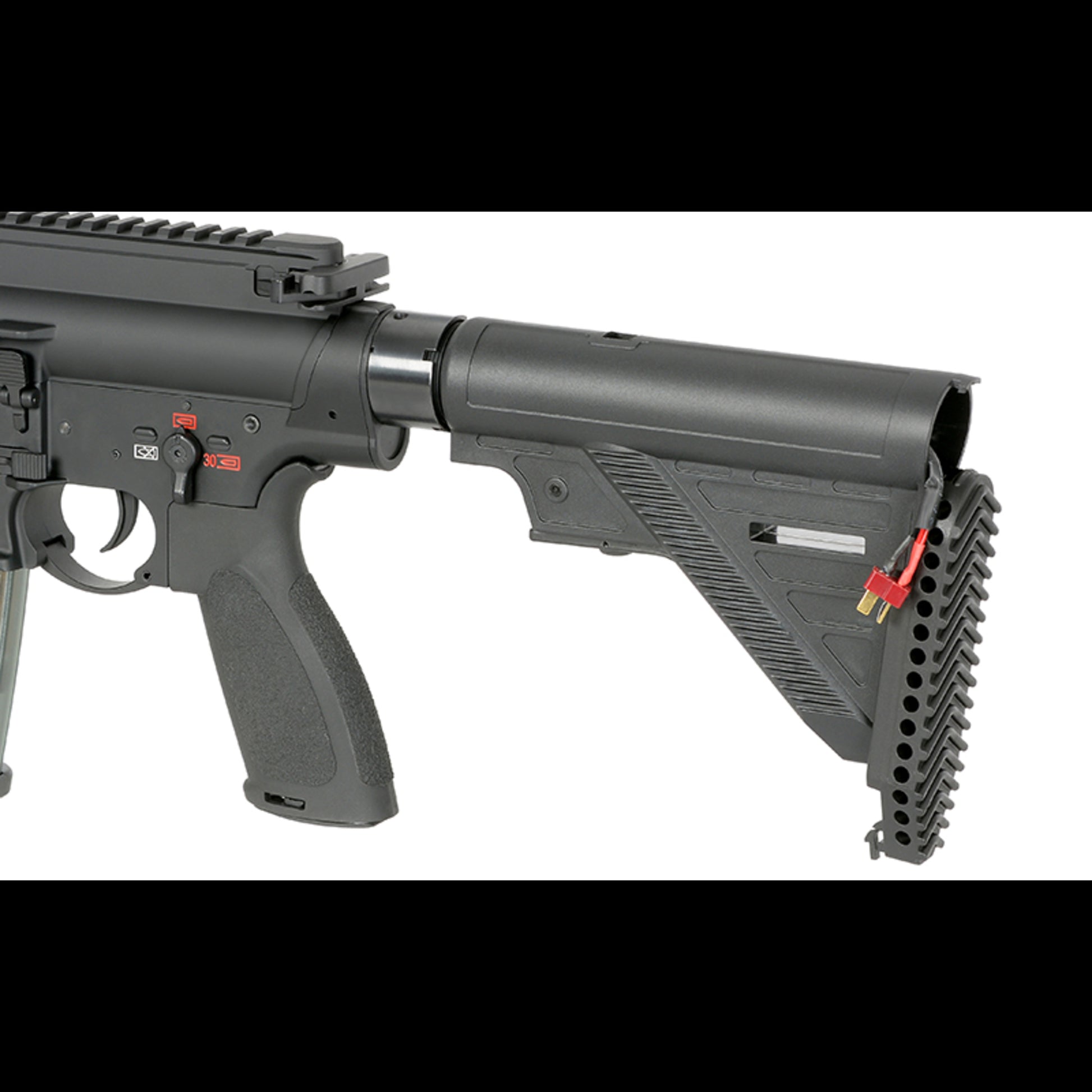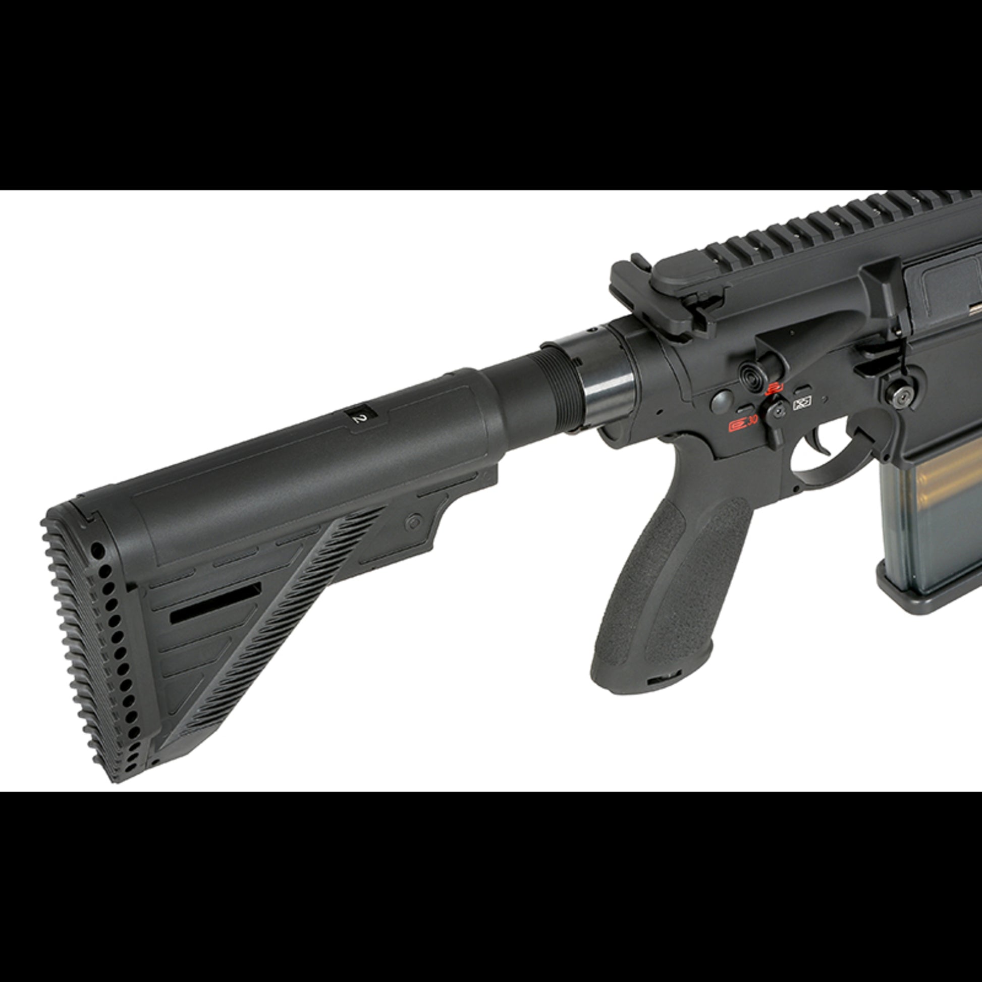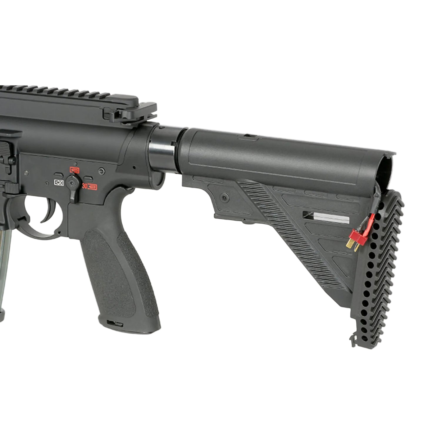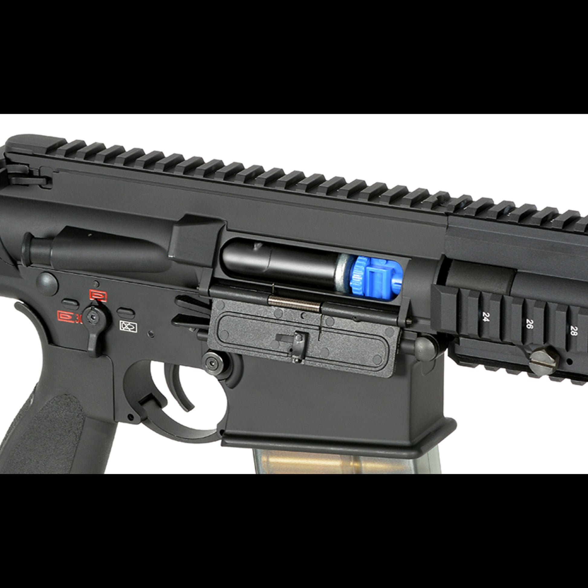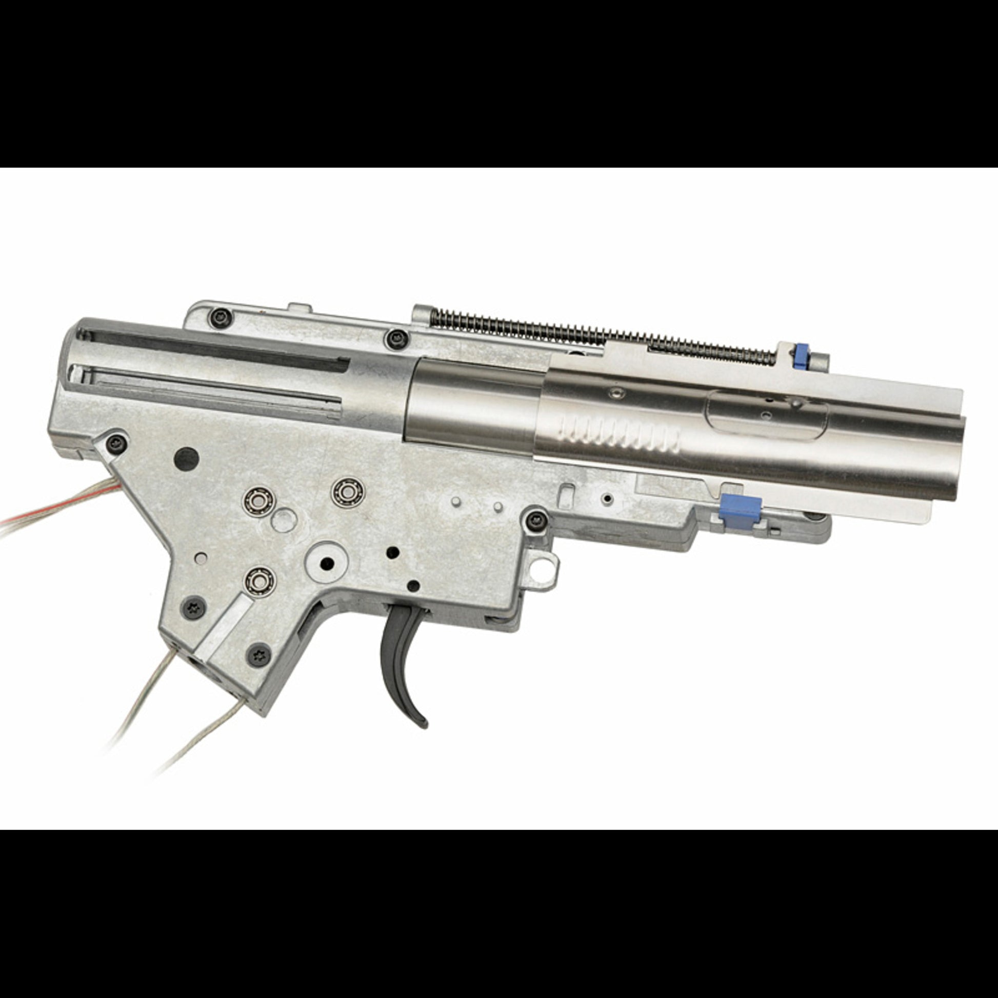In dieser Serie arbeitet eine verlängerte SR25-Gearbox. Das macht im Alltag einen echten Unterschied: Die Plattform bleibt variabel und umbaubar, bringt ein Federschnellwechselsystem mit und ist TM-kompatibel, was dir bei Teilen und Upgrades die Arbeit deutlich einfacher macht. Intern läuft ein Piston mit Stahlzahnreihe und als Steuerung die Kestrel V2. Dezent, aber effektiv: Beim Lauf ist ein verbessertes Hop-Up-Gummi als R-Hop verbaut, damit das Setup sauber und konstant schießt.