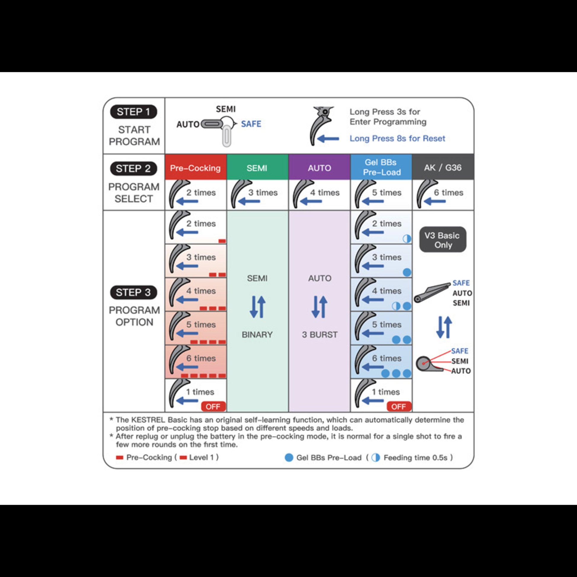 Die Kestrel V2 ist das programmierbare MOSFET/ETU-Herz: Fire-Modes lassen sich anpassen (z.B. Burst/Binary je nach Setup), Pre-Cock in Stufen einstellen und die Trigger-Response wird deutlich direkter. Dazu kommen Schutzfunktionen für Mechanik und Akku, damit das System nicht unnötig gestresst wird.