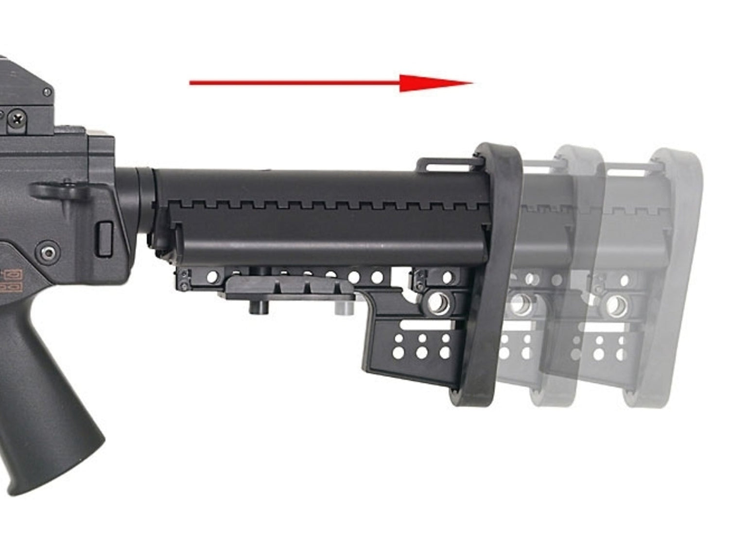 Die verstellbare AR-15-Schulterstütze bringt ein deutlich flexibleres Handling in die Plattform. Über mehrere Raststufen lässt sich die Länge schnell an Anschlag, Körpergröße und Gear anpassen, was die Schulteranlage konsistent hält. Ergebnis: saubere Kontrolle, bessere Führigkeit und ein deutlich effizienterer Umgang im Spielbetrieb.