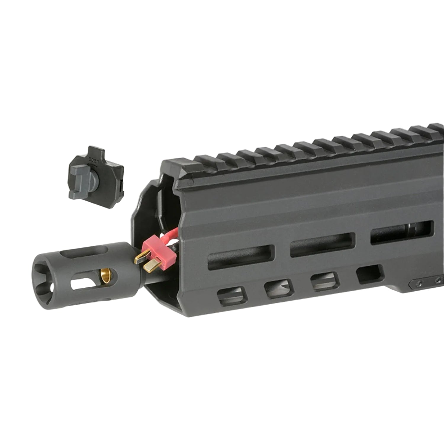 Im Handguard ist Platz für Stick-Type-Akkus, der T-Plug (Dean) sitzt sauber erreichbar. Das System ist bewusst auf 7,4V Lipo Akkus abgestimmt und läuft damit zuverlässig so wie Langlebig.