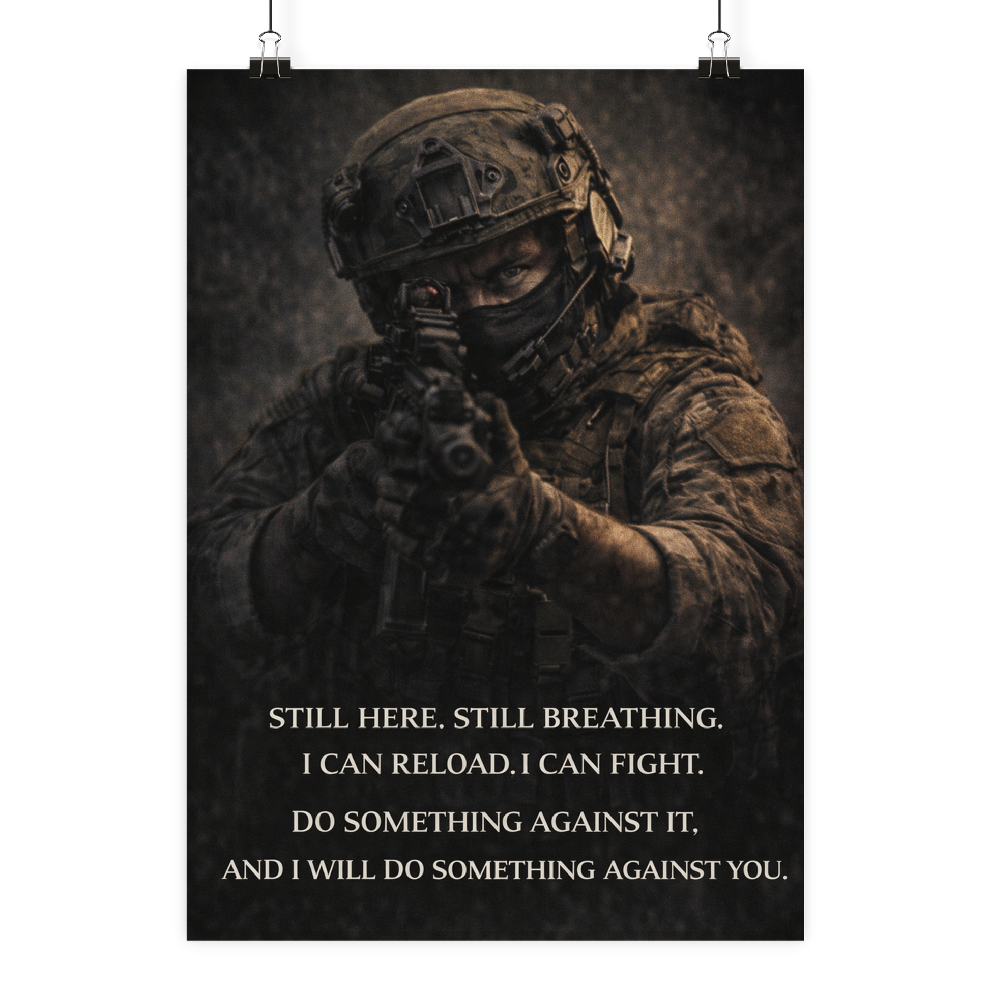 „Still here, still breathing. I can reload, I can fight. Do something against it and I will do something against you.“
